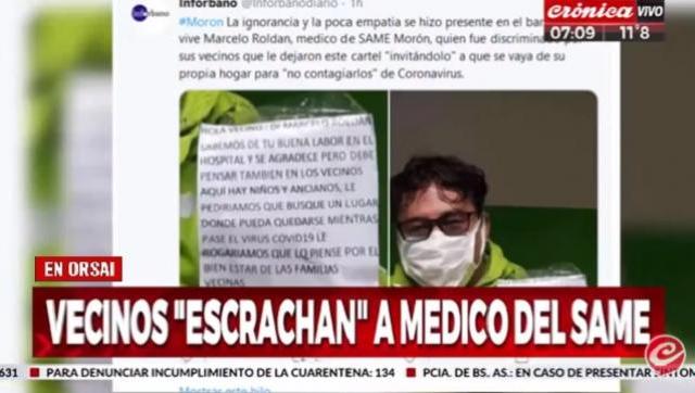 "Hola vecino Dr Marcelo Roldan. Sabemos de tu buena la labor en el hospital y se agradece,pero debe pensar también en los vecinos. Aquí hay niños y ancianos. Le pediríamos que busque un lugar donde pueda quedarse mientras pase el virus Covid-19. Le rogaríamos que lo piense por el bienestar de las familias vecinas. Muchas gracias. Atte. Los vecinos"