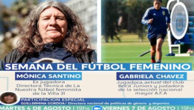 En el marco de la Semana del fútbol femenino, disertarán por Zoom los días martes 4 y viernes 7 de agosto a las 19 horas: la ex-jugadora y Directora Técnica de La Nuestra fútbol feminista de la Villa 31 Mónica Santino, y la actual jugadora del club Boca Junior y de la Selección Nacional Mayor de la Asociación de Fútbol Argentina (AFA) Gabriela Chávez; quienes contarán sus experiencias, sus logros personales y profesionales.