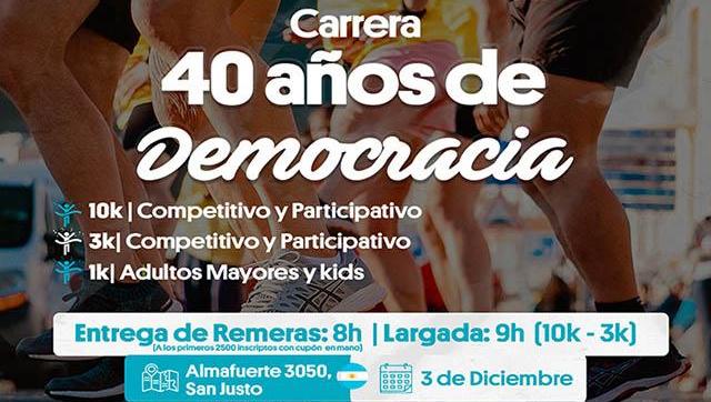 El Municipio de La Matanza organiza la "Carrera por los 40 años de la Democracia", el domingo 3 de diciembre a las 8 horas en la Plaza General San Martín de San Justo (frente al municipio), Almafuerte 3050.