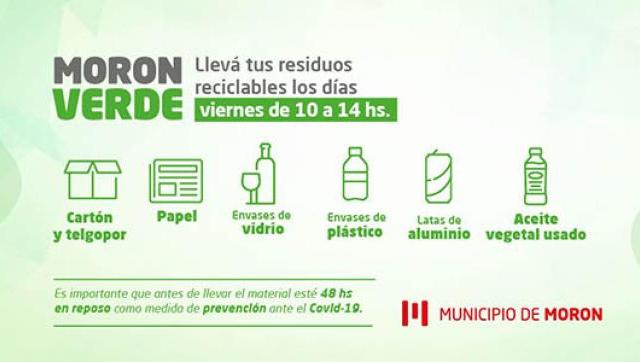 El Municipio relanza el programa de recolección diferenciada de residuos reciclables Morón Verde, que en esta etapa, el marco de la emergencia sanitaria, funcionará a partir de esta semana todos los viernes de 10 a 14hs, en diferentes puntos del distrito.