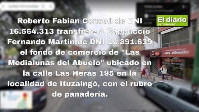 Roberto Fabian Consoli de DNI 16.564.313 transfiere a Cappuccio Fernando Martin de DNI 22.891.639 el fondo de comercio de "Las Medialunas del Abuelo" ubicado en la calle Las Heras 195 en la localidad de Ituzaingó, con el rubro de panadería.