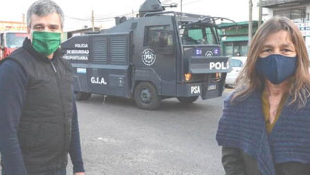 El intendente Juan Zabaleta y la ministra de Seguridad de la Nación, Sabina Frederic, supervisaron en Hurlingham un operativo de desinfección que llevó adelante la Policía de Seguridad Aeroportuaria con el camión hidrante de la fuerza para prevenir la propagación del coronavirus. La unidad móvil, que tiene una capacidad de 3000 litros por carga, trabajó en una zona de la Avenida Vergara, un tramo importante de la calle Bustamante y luego se desplazó al interior del barrio San Damián, en la localidad de William Morris. Contó con la participación de los Bomberos Voluntarios del distrito.