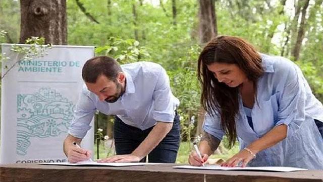 Damián Selci y la ministra de Ambiente de la provincia de Buenos Aires, Daniela Vilar, firmaron un convenio de reforestación.