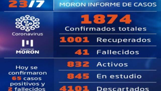 El municipio de Morón notificó el fallecimiento de dos mujeres (de 74 y 79 años) y se informaron 65 casos positivos de coronavirus: 32 mujeres y 33 hombres. De esta forma, las personas fallecidas desde el inicio de la pandemia son 41 y las recuperadas 1.001; es decir, que los casos activos a hoy son 832.