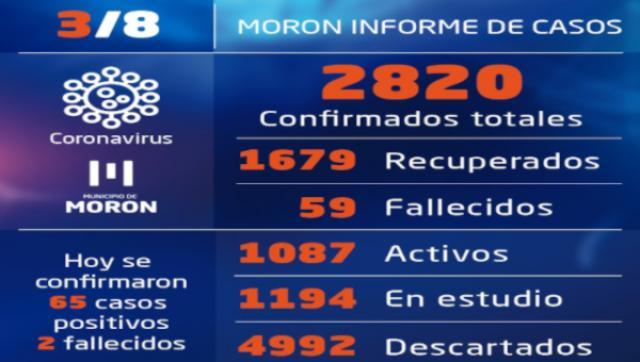 Con los nuevos registros, los moronenses fallecidos desde el inicio de la pandemia son 59, los recuperados 1.679 y los confirmados 4.992.