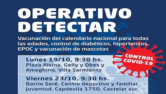El Gobierno local continúa realizando los operativos de detección temprana de Covid-19, durante la próxima semana realizarán dos nuevas jornadas por la mañana. Este lunes 19, se desplegará en la Plaza Alsina, ubicada en Gelly y Obes y Ameghino, Villa Sarmiento; mientras que el viernes 23 se llevará a cabo en el Centro deportivo y familiar Juventud, Capdevilla 1750, Barrio Seré, Castelar sur.
