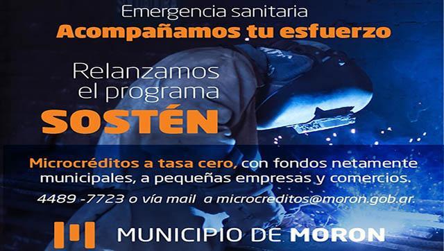 El Municipio de Morón anunció un paquete de medidas económicas frente a la situación sanitaria. Entre ellas, informó que sigue en vigencia el Programa SOSTÉN. El mismo busca preservar puestos de trabajo y reducir el impacto ocasionado por la pandemia de Covid-19, otorgando microcréditos a tasa cero de $25.000 y $30.000, a ser devueltos en 10 cuotas sin interés.
