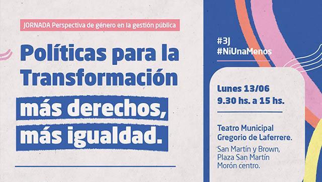 El Municipio de Morón organizará el encuentro Políticas Para La Transformación. Más Derechos, Más Igualdad. Se realizará en el marco del Ni Una Menos para ampliar los debates en materia de género y diversidad y será este lunes 13 de junio en el Teatro Municipal Gregorio de Laferrere, Brown 980.