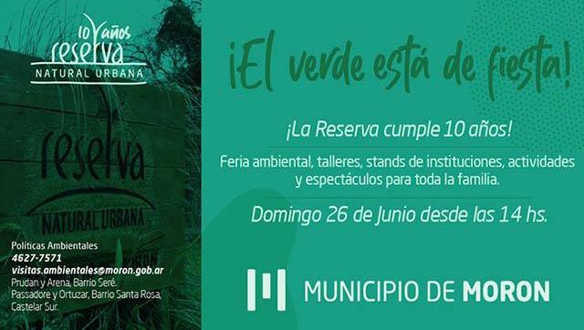 El Municipio de Morón festejará el 10º aniversario de la Reserva Natural Urbana de Morón con actividades recreativas y espectáculos destinados a toda la familia. Será este domingo 26 de junio desde las 14 hasta las 18, en Coronel Arena 3202, Castelar sur.
