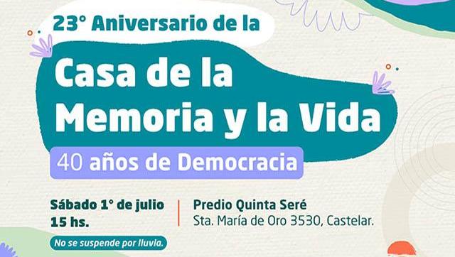 El sábado 1 de julio, la Casa de la Memoria y la Vida cumple su 23º aniversario dedicada a ejercitar, promover y mantener viva la memoria colectiva. En conmemoración, el Municipio brindará una serie de propuestas artísticas y culturales, charlas y exhibiciones gratuitas desde las 15, en el Polideportivo Gorki Grana — Predio Quinta Seré (Santa María de Oro 3530, Castelar).