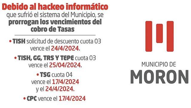 El Municipio de Morón dispuso prorrogar los vencimientos de las Tasas correspondientes al mes de abril, luego de restituir el normal funcionamiento del sistema municipal de cobros, que había sido afectado por un hackeo informático.