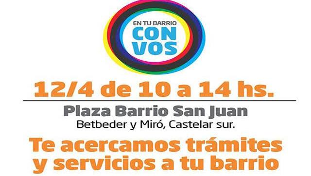 El programa que acerca trámites, servicios y postas de salud a las vecinas y vecinos de todos los barrios del distrito, estará presente el próximo viernes 12 de abril en la Plaza Barrio San Juan (Betbeder y Miró, Castelar sur).