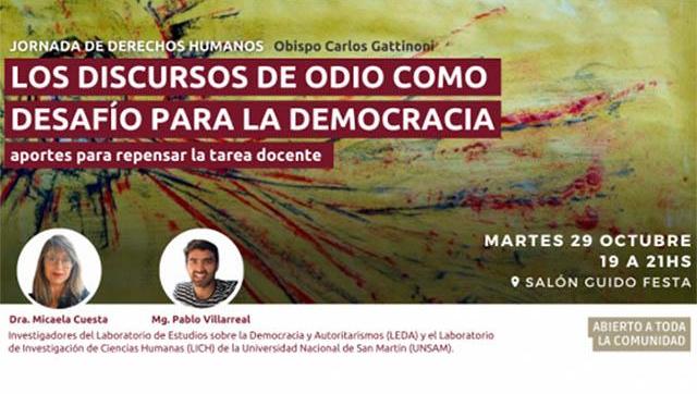 El tema de la jornada de este año es “Los discursos de odio como desafío para la democracia: aportes para repensar la tarea docente” y estará a cargo de la Dra. Micaela Cuesta y el Mg. Pablo Villarreal, investigadores del Laboratorio de Estudios sobre la Democracia y Autoritarismos (LEDA) y el Laboratorio de Investigación de Ciencias Humanas (LICH) de la Universidad Nacional de San Martín (UNSAM).